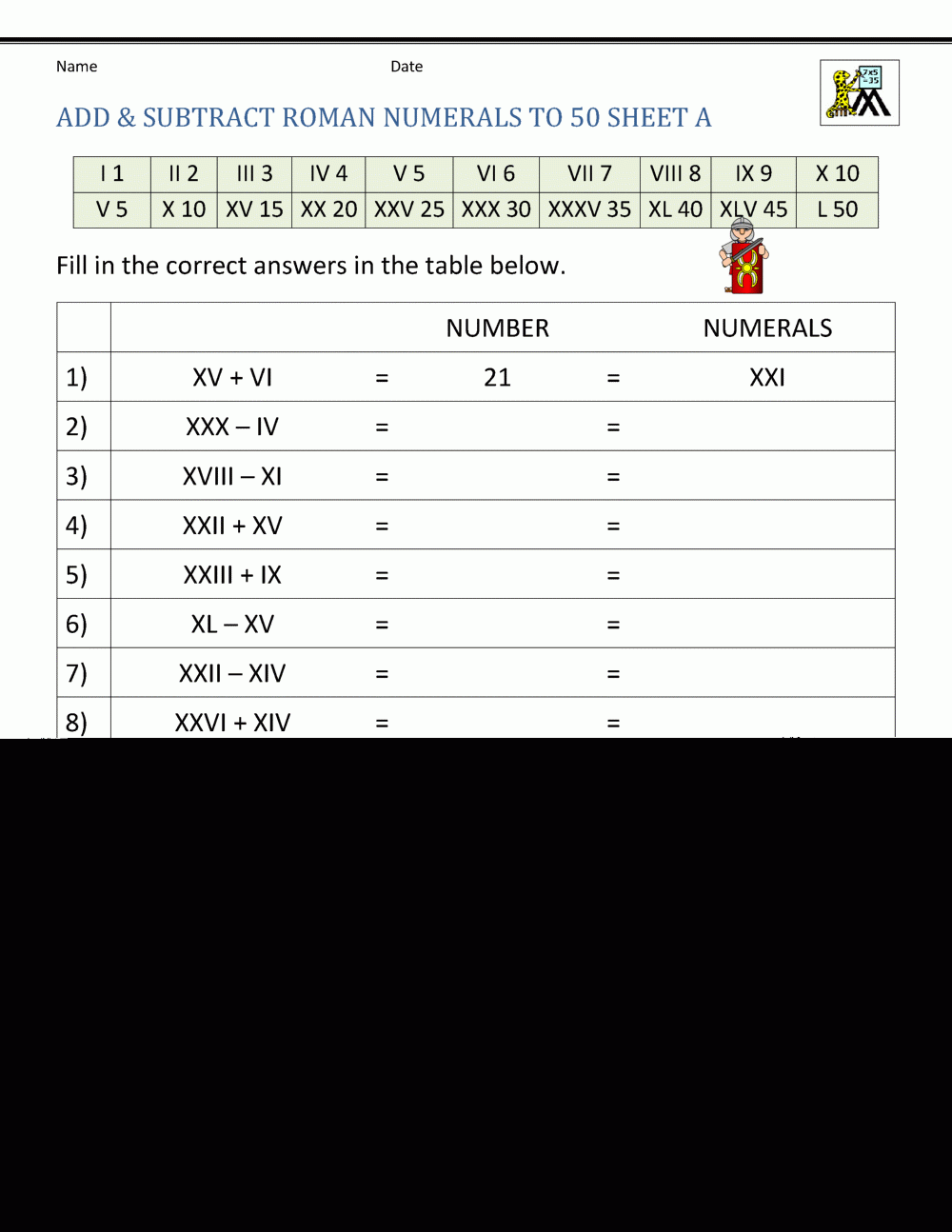 Another activity on the worksheet could be a matching game, where students match Roman numerals with their equivalent Arabic numerals. This hands-on activity can help students visually associate Roman numerals with their numerical values, making it easier for them to remember and use them in the future.