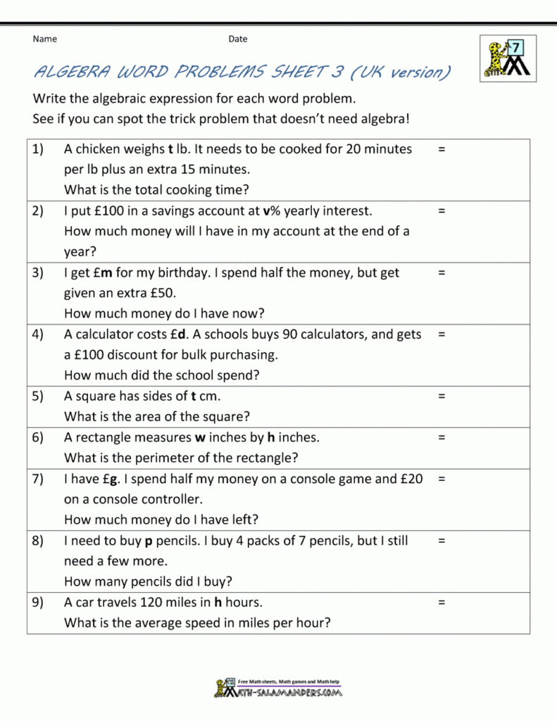 When working on a word problems worksheet in PDF format, students should carefully read each problem and identify key information such as quantities, rates, and relationships between variables. They should then define the unknown variables and use them to write an equation that accurately represents the problem. For example, if the problem involves finding the total cost of several items given their individual prices, students can define variables for the total cost and the prices of the items and then write an equation to calculate the total cost.